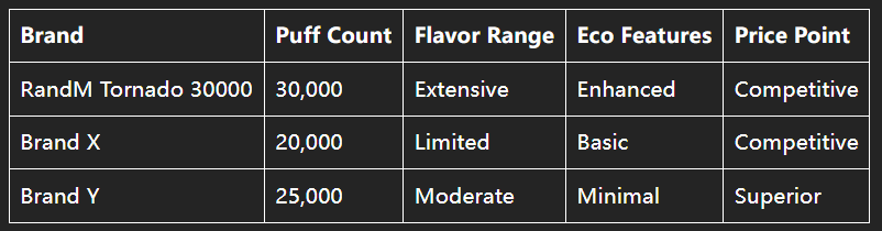 Analyse comparative : RandM Tornado 30000 vs. concurrents